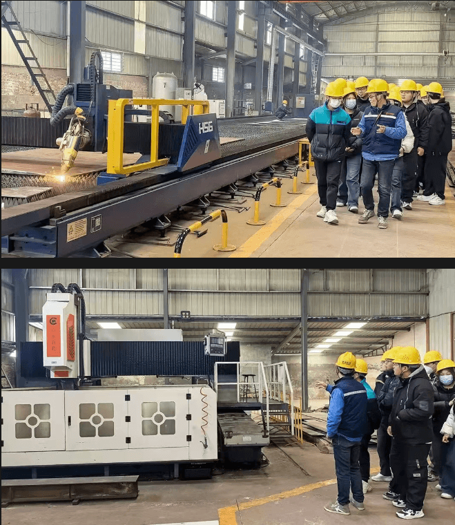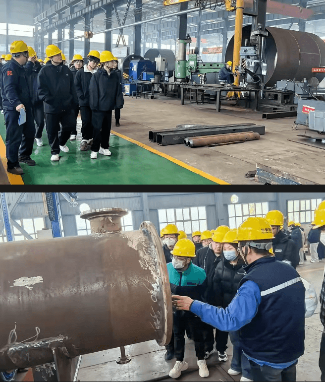 Under the leadership of Jiang Guosheng, the head of the Boiler Business Department, and Liu Xinhong, the head of the Vessel Business Department, the students visited our production workshop. From the screening of raw materials to the processing of components, from welding techniques to overall assembly, they were given a detailed introduction to the complete production process and workflow of boilers and pressure vessels. This provided the students with a more intuitive understanding of the entire product process.