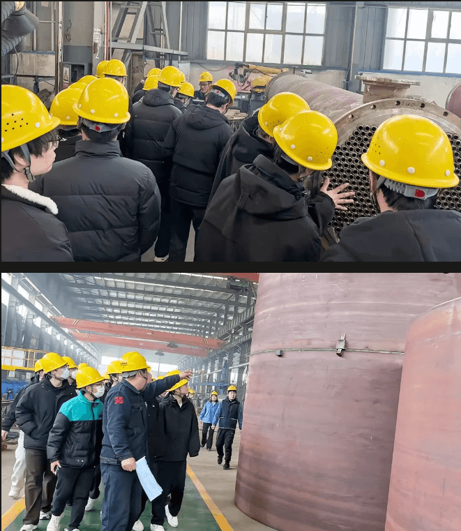 Under the leadership of Jiang Guosheng, the head of the Boiler Business Department, and Liu Xinhong, the head of the Vessel Business Department, the students visited our production workshop. From the screening of raw materials to the processing of components, from welding techniques to overall assembly, they were given a detailed introduction to the complete production process and workflow of boilers and pressure vessels. This provided the students with a more intuitive understanding of the entire product process.